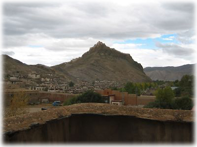 ![]() ギャンツェ・クンブムから見るギャンツェ城。三角形の岩山のてっぺんのとんがっている部分がお城。映画「セブン・イヤーズ・イン・チベット」で最後の戦いが行われたあの城である |