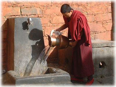 ![]() タシルンポ寺で水汲みをするラマ。乾燥しているチベットだけに、水は重要だ。見ていると何度も何度も行き来していた |