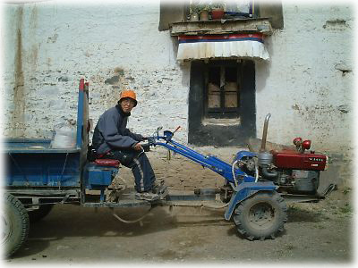 ![]() あまりに歩きつかれたのでトラクターに乗って帰ろうと誘う夫(笑)。でも実際にチベットにいるとこんなトラクターから声をかけられることもしばしば |