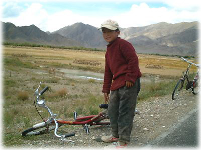 ![]() 車を止めてトイレに行くと、どこからか自転車に乗った少年が現れる。チベットの子供はみんなものすごく目が良いようで、途中誰もいないところに車を止めたように思っても、遠くのほうから「見つけた〜」とばかり走ってやってくる |