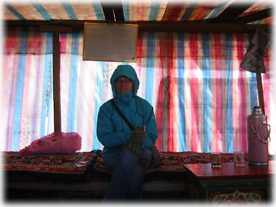 ![]() さすがエベレスト? 外は異常に寒い。テントの中に非難して、温かいお茶でほっとひと息つく。しかしまだ顔が凍ってる |