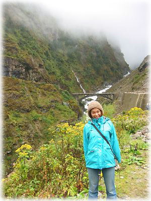車は一路、ネパール国境を目指す。途中、ガスがかかって見晴らしが悪い。車が雲に飲み込まれそうな図 |