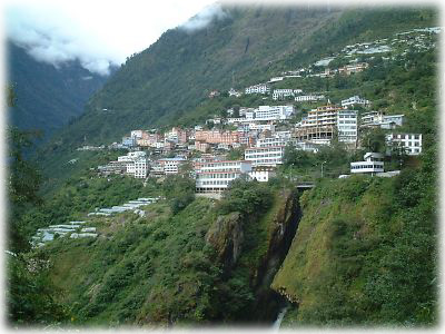![]() チベット(中国)側の国境の街、ダム。国境だからといって無理やり街にしてみました、ってな感じで山から街が生えているみたい |