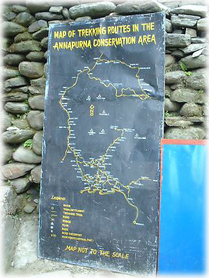 アンナプルナ入口にあった地図。全部回るのには一体何日かかるのかしら? ちなみに私たちが行くところはアンナプルナのほんの玄関先 |