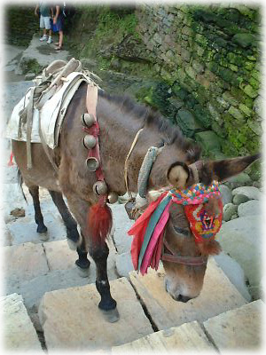 山道ですれ違う動物ナンバーワンはポニー(小型馬)。たいてい先頭のコは頭にキュートな飾りをつけて、首元の鈴をカラカラと鳴らしながら歩いていく |
