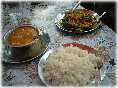 ![]() ようやくひと休み。ロッジでのランチはエッグ・カレーにネパール風やきそば。お腹ペコペコの身には、とにかくなんでもウマク感じる |