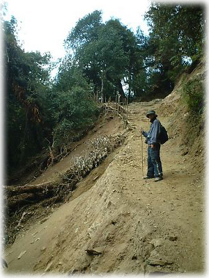 視界が開けたと思ったら、土砂崩れのあと。写真左手が倒れてしまった木 |