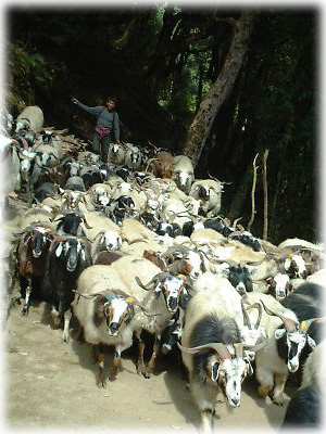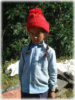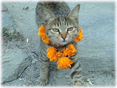 ![]() 村の出口にて、ティハール(お祭り)用の花輪をかけたネコちゃんがお見送りしてくれた。早くポカラに戻らないと、お祭りが始まっちゃうわ、という暗示かしら? |