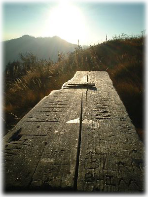 イエーイ、山頂だあ、というわけで記念写真、パチリ。最近、ダンナはヒゲヅラ、妻はプクプクな吉田家 |