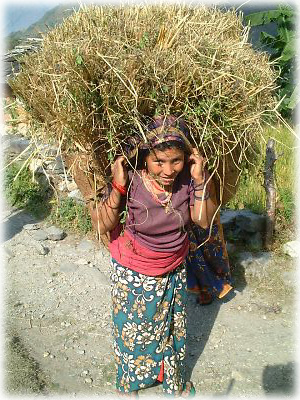 干草を運ぶ美少女。老若男女、みなおでこにヒモをかけて物を運ぶ。それにしても村の人たちはみな働き者だ |