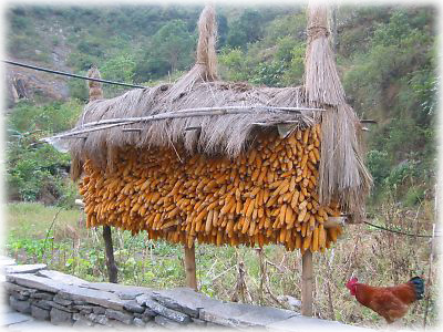 ![]() 村の入口では干されたとうもろこしとニワトリさんがお出迎え。いろんなところで干されていたとうもろこしですが、実にうまそう。ちなみに挽いて粉にするらしい |