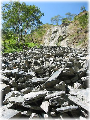 山を下っていたら、巨大な土砂崩れの跡が。こんな石たちがゴーっと押し寄せてきたら、ひとたまりもナイ…… |