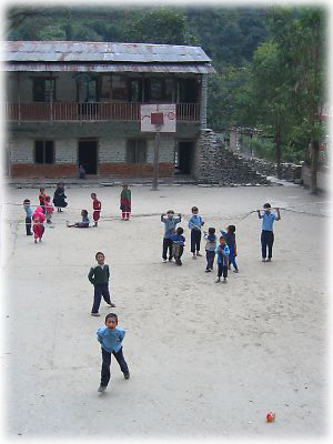 大きめの村には立派な学校が。ここぞとばかりドデカイ声で「ナマステ〜」と言うと、元気な黄色い声で「ナマステ〜」と返事が返ってきた。うれしい |