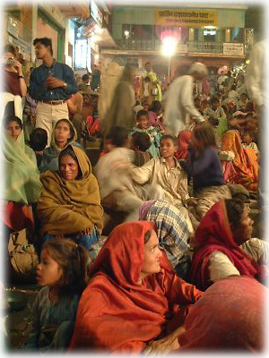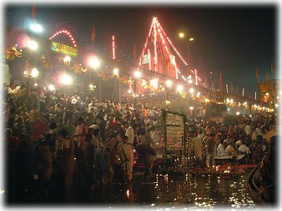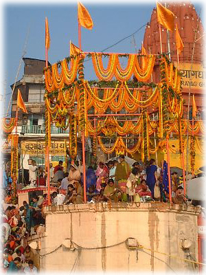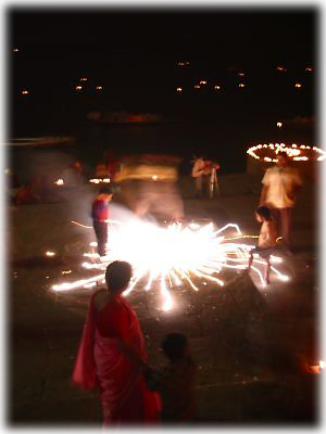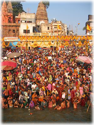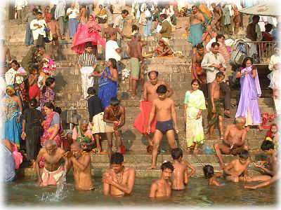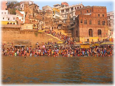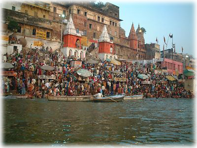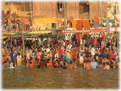 ![]() ディワーリーの日はバラナシが一年間でもっとも混雑する日のうちのひとつ。この日の朝には各地から沐浴客が多数押し寄せる |