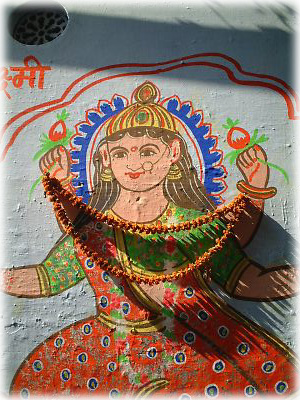 ガートのそばにいた女神。こういうのがそこら中にあるから、バラナシの街はどことなくポップ。お祭りにあわせて花飾りが飾られている |