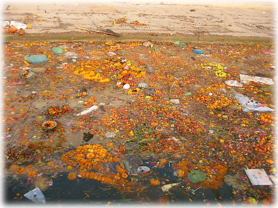 ![]() 河のへりにはたくさんのゴミと花輪が。みんな、ここぞとばかり河にお祝いの花を流す。これらをみな飲み込んでガンガーは流れているのだ |