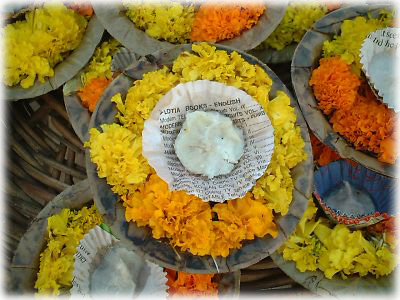 ![]() ロウソクをのせた花小舟。これに火をともし、河に流す。夜にこれらが河に流れていく姿は実に幻想的。ちなみに一個2ルピー。人によっては5ルピーとボってくるが(笑) |