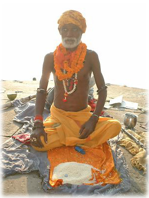 今日はサドゥーも花輪でおめかし。ちなみに手前にある白い物体はお米。お祭りには捧げ物としてお米、お花などがよく登場する |