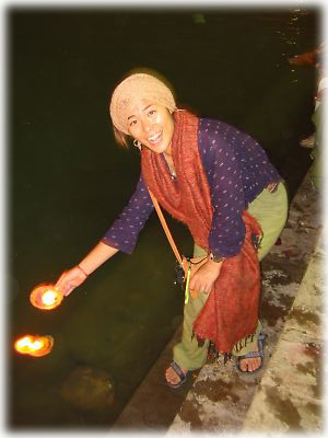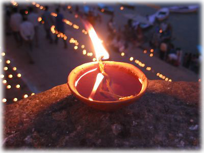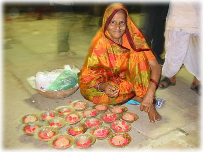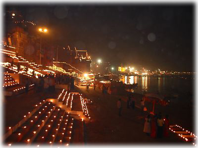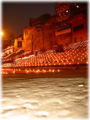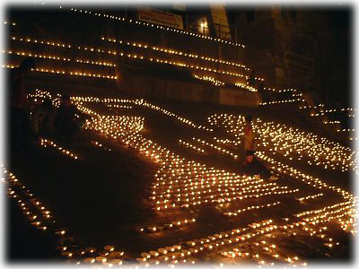 ![]() 薄暗くなってくると、ガート沿いの道や建物、べランダに無数のローソクが灯される。素焼きの器に油を注いだシンプルなローソク |