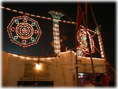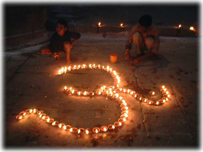 ![]() ローソクもただ並べるだけじゃなく、みな思い思いの絵柄に並べ、それに火を灯していく。こちらはオームの字を形づくっている。火を灯しているのは少年 |