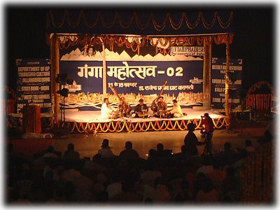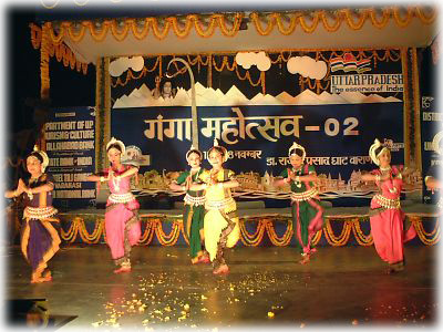 ![]() メインガートの奥のほうにはさらに大きなステージが作られており、お祭り期間中はずっと民族音楽のライブかダンス・ショーが行われていた。入場料はタダ! 太っ腹バラナシ! |