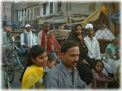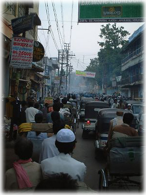 ![]() お店の数も多いけど、とにかくサイクル・リキシャー(人力三輪車)と人の数がハンパないバラナシの市街。いつもどこもゴミゴミしていて埃っぽいけど、そんなことにはめげずに突き進んでいく果敢なインド人たち。特に中央下のおじさんの目! |
