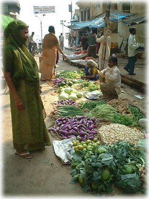 そんなゴミゴミした街のなかでも平然と野菜を売るおじさん。やっぱりインド人ってたくましい。ここインドでも茄子がおいしい季節 |