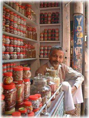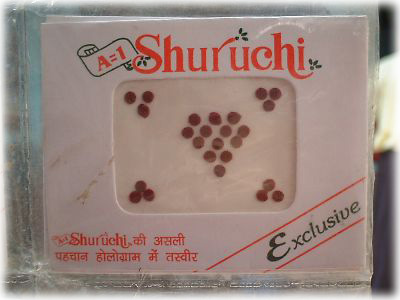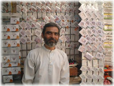 ![]() インド女性の日常には欠かせない、おしゃれティカ(おでこにつける印)屋さん。ファンシーなものを売るわりに、いかついオジサマ |