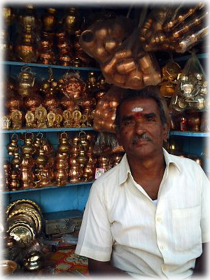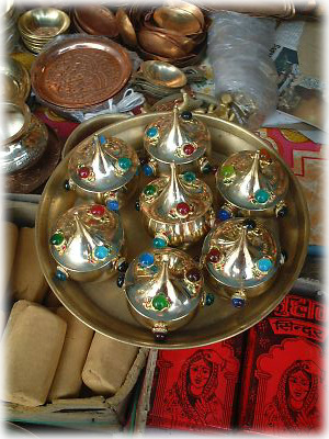真鍮の器やコップ、置物を売る店は、バラナシの中でも裕福な商人だそう。ちなみに壺にはガンガーの水を汲んでお土産にする |