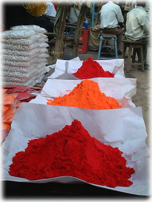 おでこにつけるティカの粉。やっぱり赤が一般的だけど、20色近い品揃えがある店もあった |
