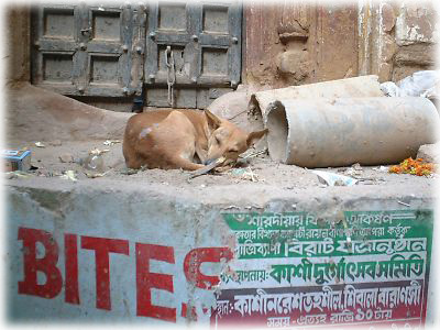 ![]() バラナシの細い道にはいつも犬があちこちにいる。たいていぐうすか寝ているか、かゆいかゆいと体を掻いてるか。こいつらはちょっとのことじゃ全然起きない |