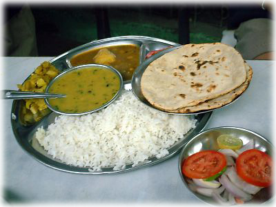 ![]() インドの定番定食、ターリー。小さな器に入っているのがダール(豆のスープ)、皿に小分けに入っているのがカレー他、ホットケーキみたいなのがチャパティ |
