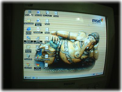 ![]() ネットカフェにてガネーシャ(象の神様)の壁紙を発見。この顔といい、このポーズといい、たまらん! 日本に帰ったら私もコレを壁紙にしたい |
