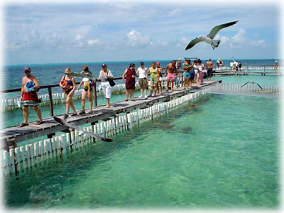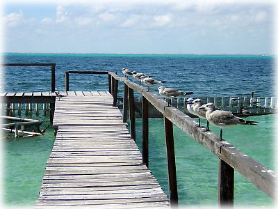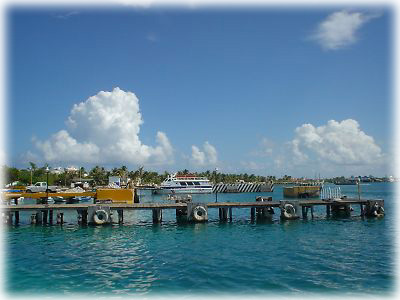 ![]() カンクンの海は、船着場でもこの美しさ! 真っ青な海がどこまでも続き、ふと波間を見るとカラフルな魚が泳いでいたりします |