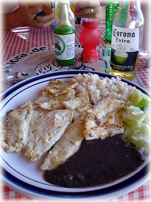 海といえばやっぱりシーフード。鶏肉のようにも見えるけど、コレはれっきとした白身の魚。シンプルに塩とにんにくで味付けしたものを、豆のソースでいただく。あ、昼間っからコロナ・ビールを空けているのがバレるな(笑) |