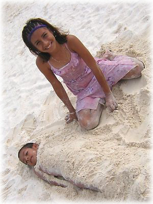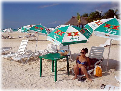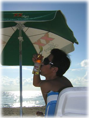 ビーチに寝転んで、昼間っからビールを飲む。ああ、極楽極楽……というわけで、メキシコ名物ビール「ソル」に感謝をささげるダンナ |