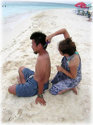 カンクンで出会ったそれぞれひとり旅のハジメくんとうえぽん。うえぽんは日本では美容師さんということで、さっそく浜辺でヘアカット大会が催されました。「風があるので切りにくい〜」と言いつつ、手つきはしっかりプロ |