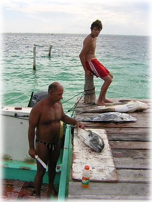 桟橋ではなにやら魚をさばいている親父が……。「ここから10キロぐらい行ったところで釣ったんだ!」とのこと。しかしどの魚も結構でかい。やるな、親父 |