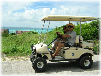 ![]() 翌日はゴルフ・カートを借りて、島内めぐりに繰り出しました。海と緑に囲まれた島をのろのろと移動していくこの乗り物、この旅で初めて乗ったけどなかなかゴキゲンなのだ |