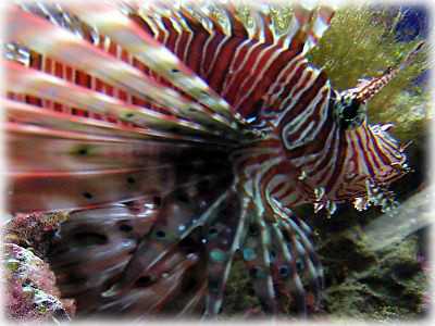 ![]() このウミガメ保護センターには小さな水族館まで併設されていて、なかなか楽しめる。こちらは別名「ライオンフィッシュ」と呼ばれるミノカサゴ。魚とは思えないフリフリな衣装ですが、実は見た目とは裏腹に触ると毒を出すワイルドな奴なのです |