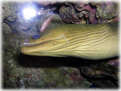 ![]() こちらは海の怪物ウツボ。見ているだけでパクっとやられそうで、ちょっとコワイ。ちなみにこのぐらい大きいウツボになると、かまれたら指1本ぐらい平気で食いちぎられるとか |