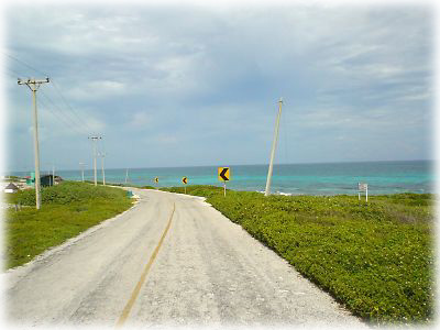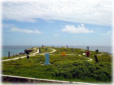 ![]() 島の最南端の岬まではゴルフカートで中心地から30分ぐらい。ホントに小さな島なのです。先端にはカリブ海を臨むマヤ遺跡がポツンとある |