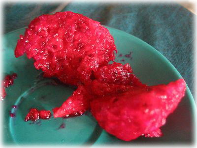 ![]() 「ツナっていったいどんな果物なわけ?」 とお店の人に尋ねたところ、出してくれたのがコレ。緑のサボテンをむくと、こんな赤紫の身が出てくるのだそう。食感はぐにゃぐにゃとしていて水っぽく、味は薄甘い。マズくはないけれど、そんなにおいしくもなかった…… |