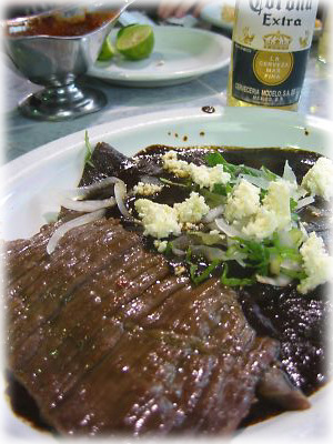 メキシコ料理の傑作といえば、チョコレートを使ったモーレ・ソース。写真のように牛肉にタラリとかけることもあれば、このソースで鶏肉を煮込んだりもする。ちょっぴり甘みのあるこってりとしたソースは肉料理によく合う |