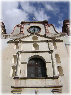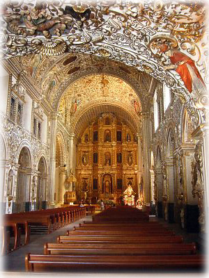 ![]() 教会入口を入ってすぐの天井にもこんな装飾がびっしりとなされている。これは聖ドミンゴを中心とした聖者の相関図で「生命の木」と名づけられている |