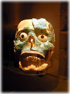 近郊のモンテ・アルパンから出土した、ルビーをまとったガイコツ。ギョロリとした目玉といいい、半開きの口といい……「何か用か、オメエさんよう」とか言い出しそう(笑) |