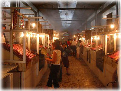 ![]() メルカド(市場)の一角にあるバーベキュー通り。ここでは肉屋と焼き屋?が一緒になっている。客が肉を指定して、お店の脇の炭火で焼いてもらうシステムだ。いつも炭火のいい匂いで包まれている |