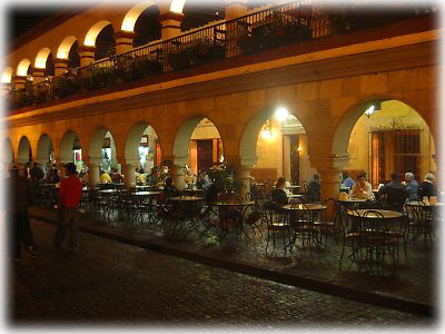 ![]() 広場を取り囲んでいるのは、おしゃれなオープン・カフェ。もちろん観光客用で、お値段もそれなりです。コロニアル調に弓形アーチを携えた造りは、いかにもヨーロッパ風だな |