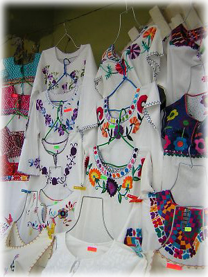 オアハカでカワイイものといえば、なんといってもインディヘナの手で施された刺繍つきのブラウス。種類もいろいろあって、見ているだけでも飽きない。もちろん妻は購入済み |