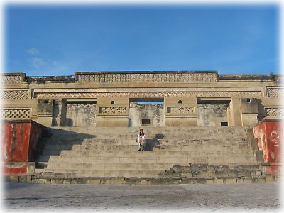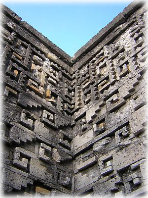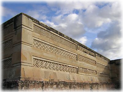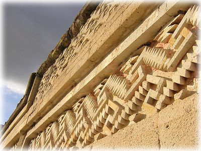 ![]() ミトラ遺跡の見所といえば、なんといってもこのモザイク模様。小さく切断した石をはめ込んで作られたもので、ここを造ったサポテカ人のセンスをうかがわせる |